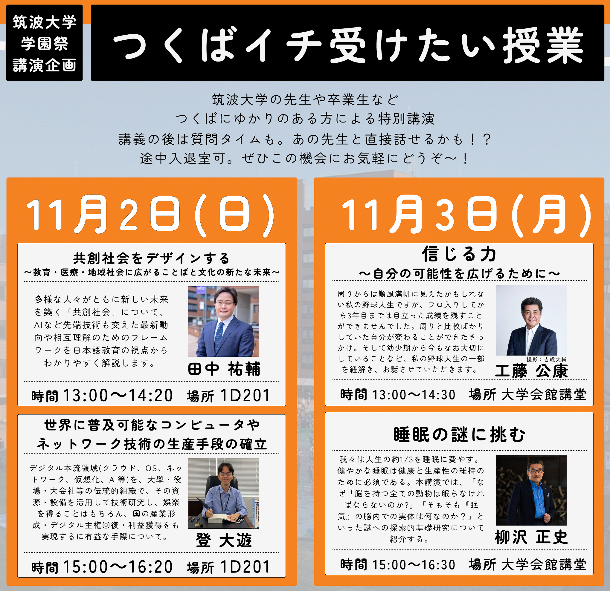 11月2日(日)・11月3日(月祝)に開催される筑波大学雙峰祭企画『つくばイチ受けたい授業』に田中祐輔教授が登壇します。